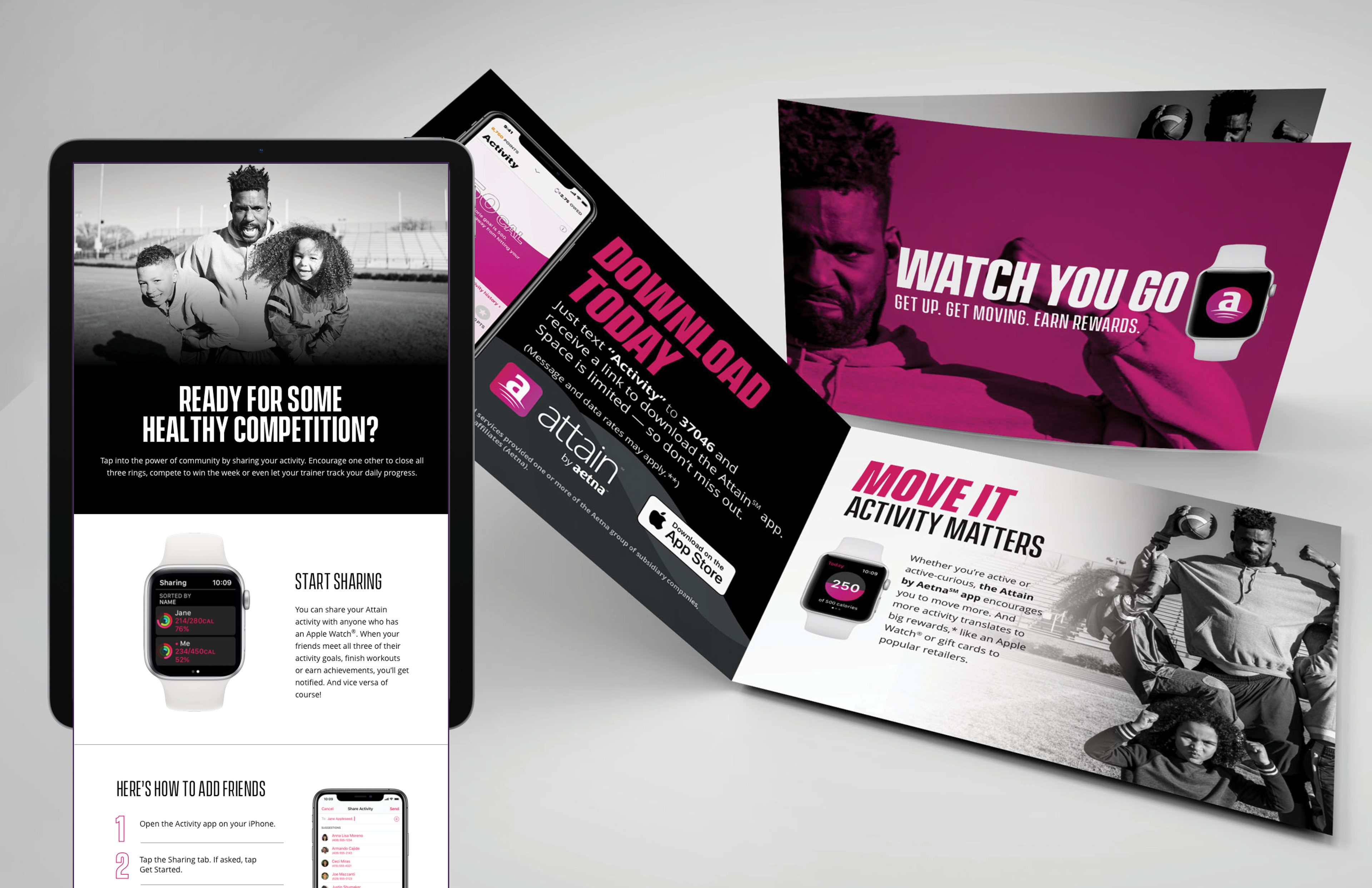 The Attain app is a first-of-its kind health experience designed to help users follow their own path to better health. It combines an Aetna member's health history with their wearable activity data to offer personalized goals, healthy actions and rewards. To launch the app, we created a dynamic brand that drove user awareness & downloads through a website, print, email & social campaigns.